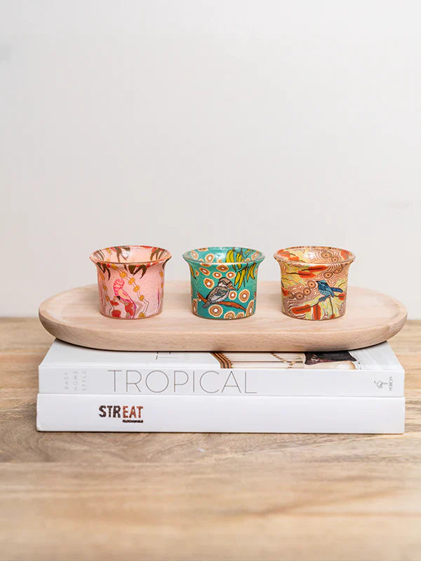 Featuring stunning artwork by the talented First Nations artist Domica Hill, this Dreamtime Symphony candle holder Votive gift pack is hand-made from glass and a layer of clay then beautifully gift boxed. The clay allows the candle flame to illuminate through and radiate the magnificent colours of the designs.