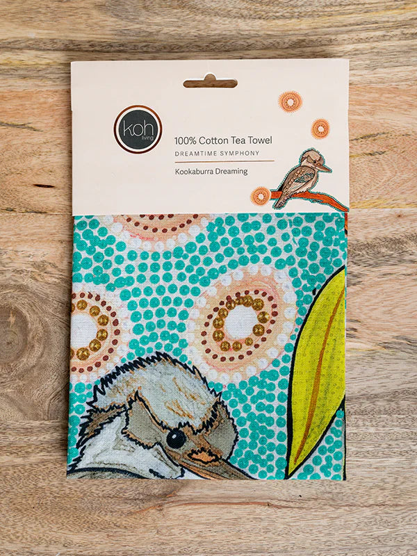 Art has a place in every room, even the kitchen. Bring some colour and style into the heart of your home with our 100% cotton tea towels from our Dreamtime Symphony range. Featuring artwork, Kookaburra Dreaming, from talented First Nations Artist Domica Hill. You can use these tea towels to dry your dishes, add some colour to your kitchen or even frame and have as an art piece in your home.