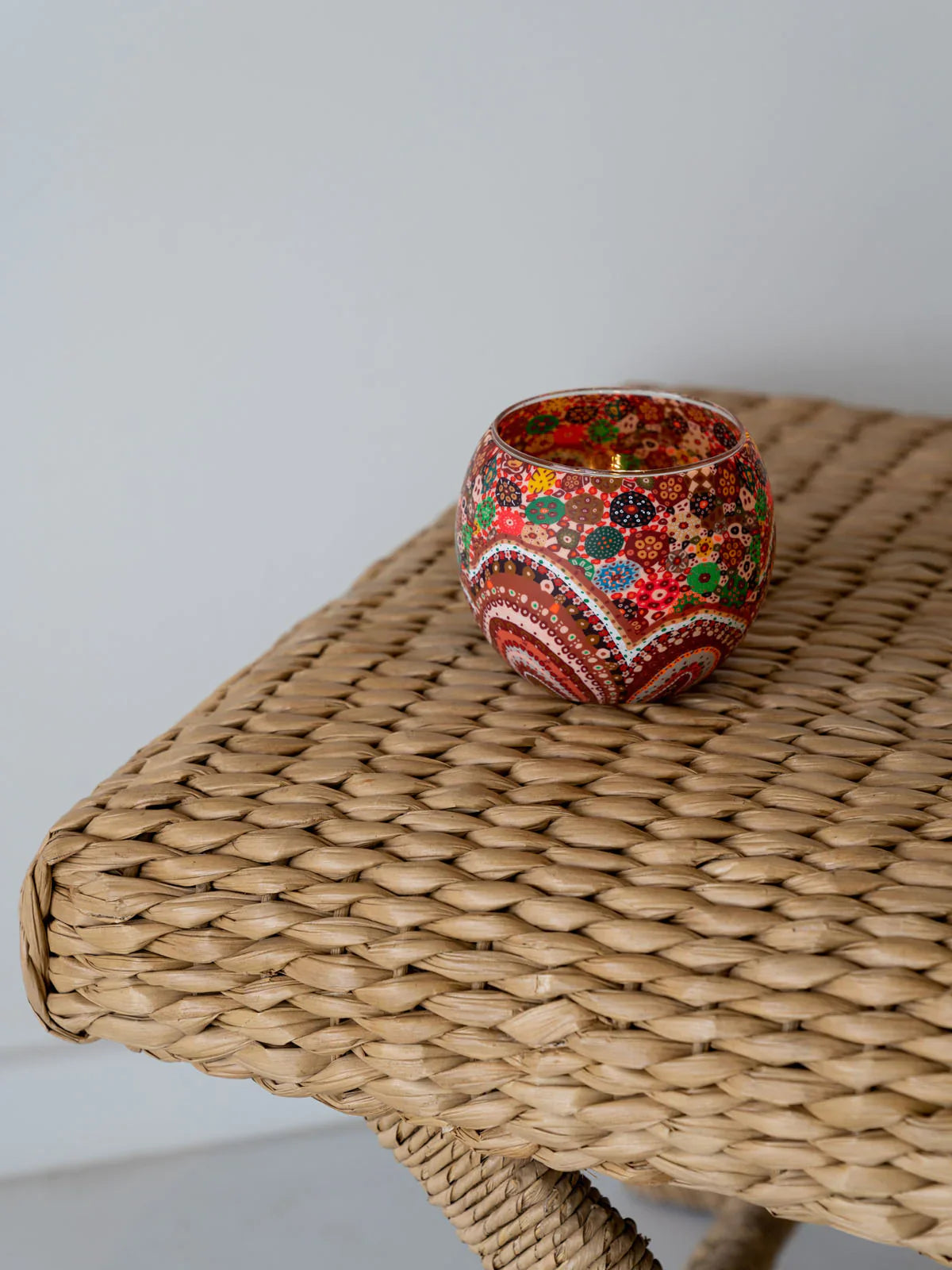 This Together Again candle holder, from the hand of Aboriginal artist Jacinta-Rai Ridgeway-Maahs, is hand-made from glass and a layer of clay then beautifully gift boxed with a story card inside. The clay allows the candle flame to illuminate through and radiate the magnificent colours of the designs, captivating any space when using one of Koh's tealights.