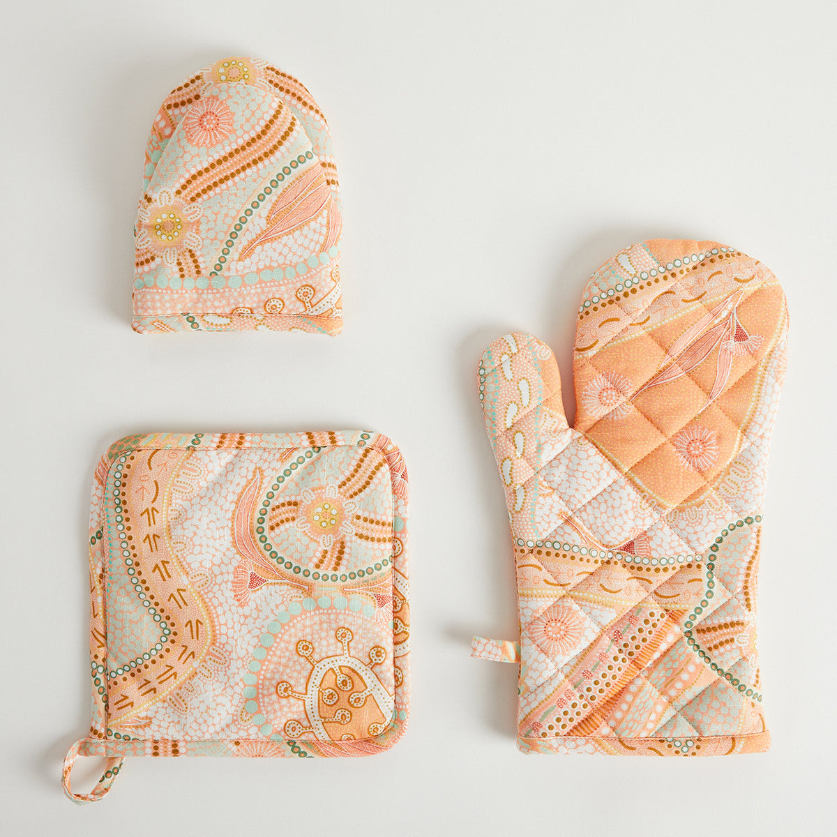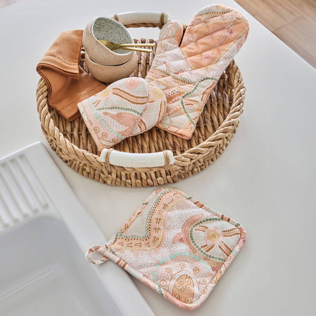 Bring in the beauty of Australian Indigenous art to your kitchen or dining area styling with the Native Country by Domica Hill tea towel range. A stunning design created by Domica Hill, a Palawa woman with ancestral ties to the northwest coast of Tasmania, Coastal Connections takes inspiration from the connection between land, water and skies and tells the story of the harmony between people, animals and nature through traditional symbols throughout the artwork. Printed on cotton and available in an oven glove, pot holder and mini oven glove and made for everyday use, this range is both stylish and functional. Our on-trend Native Country by Domica Hill Kitchen Linen is a must for your home.