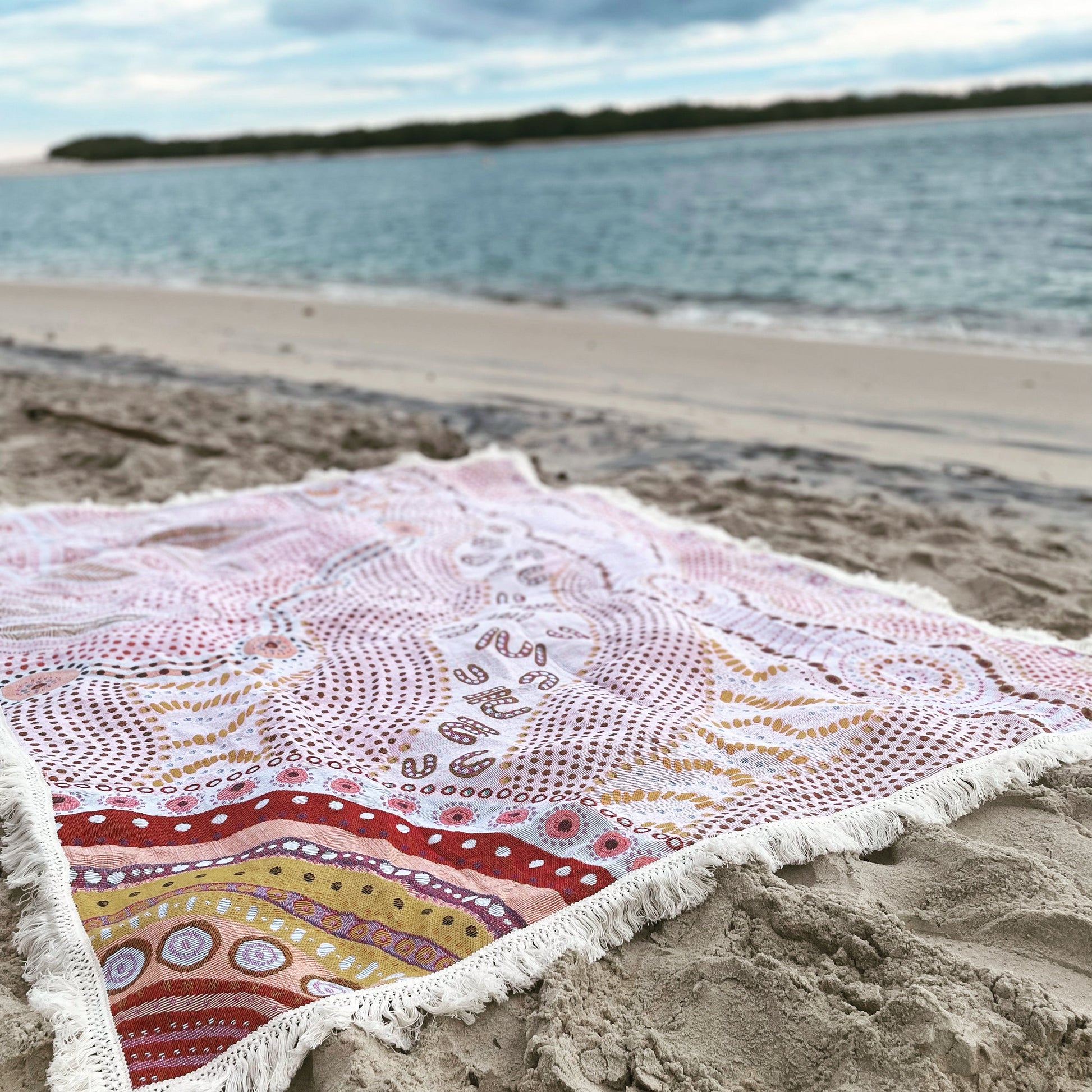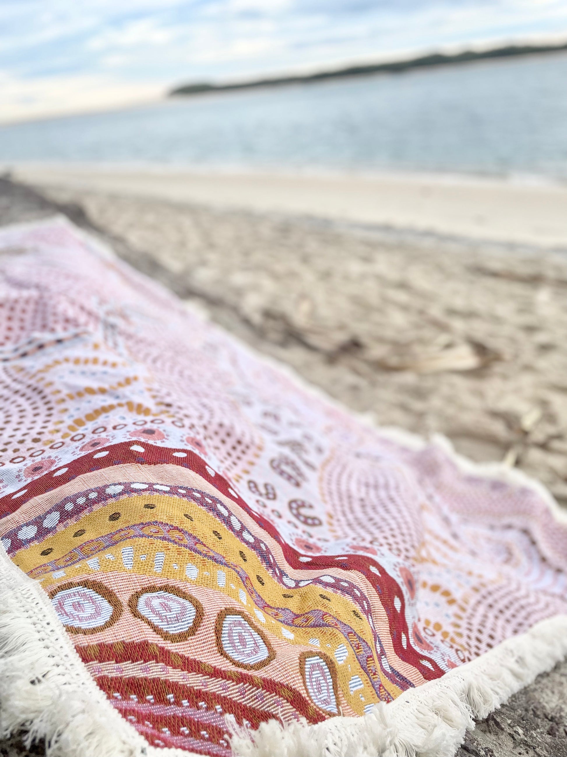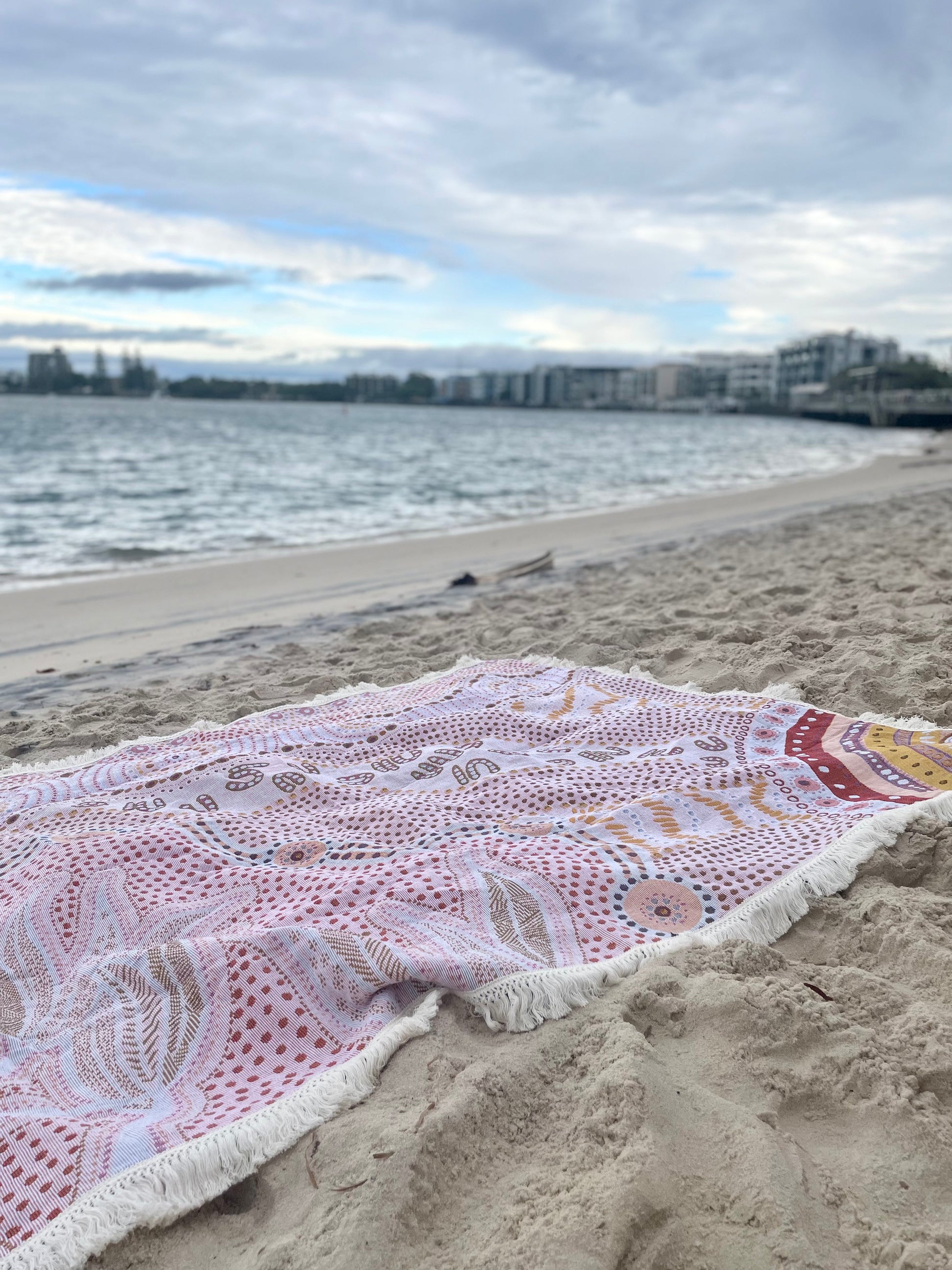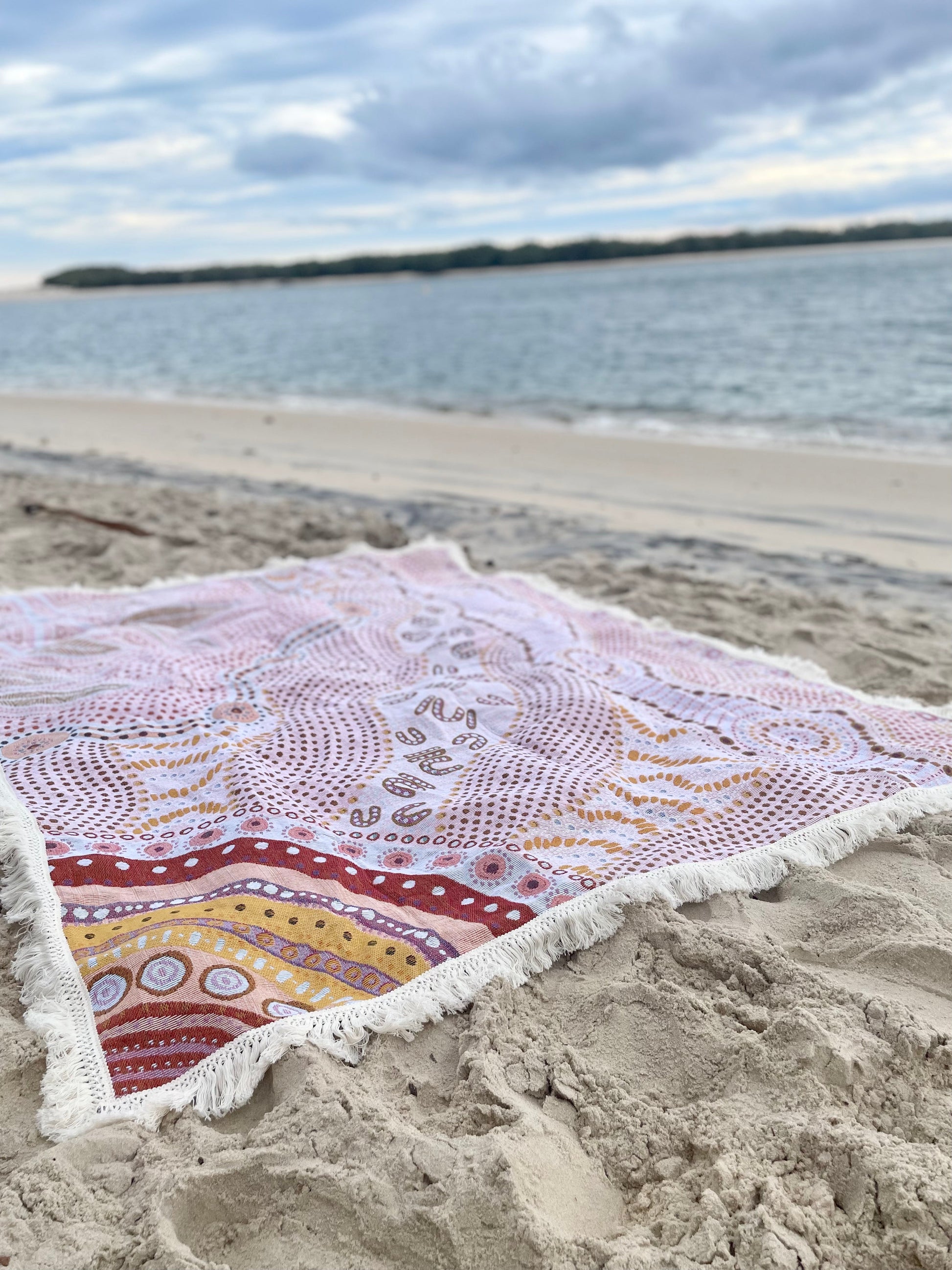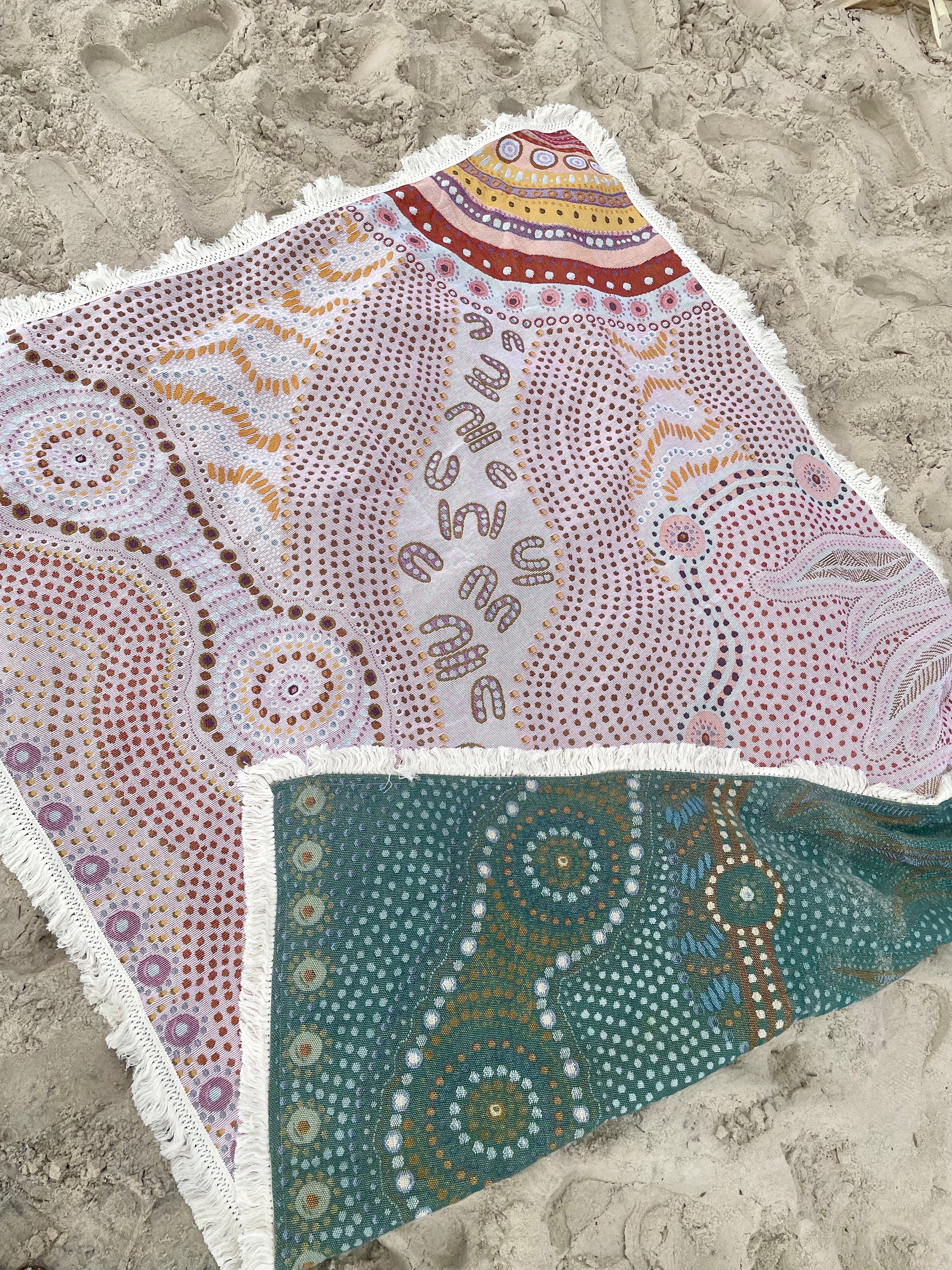 A combination of neutral nude pink tones, yellows, pastel blue and earthy colours make up this First Nations design with the reverse featuring shades of greens, blues and golds.