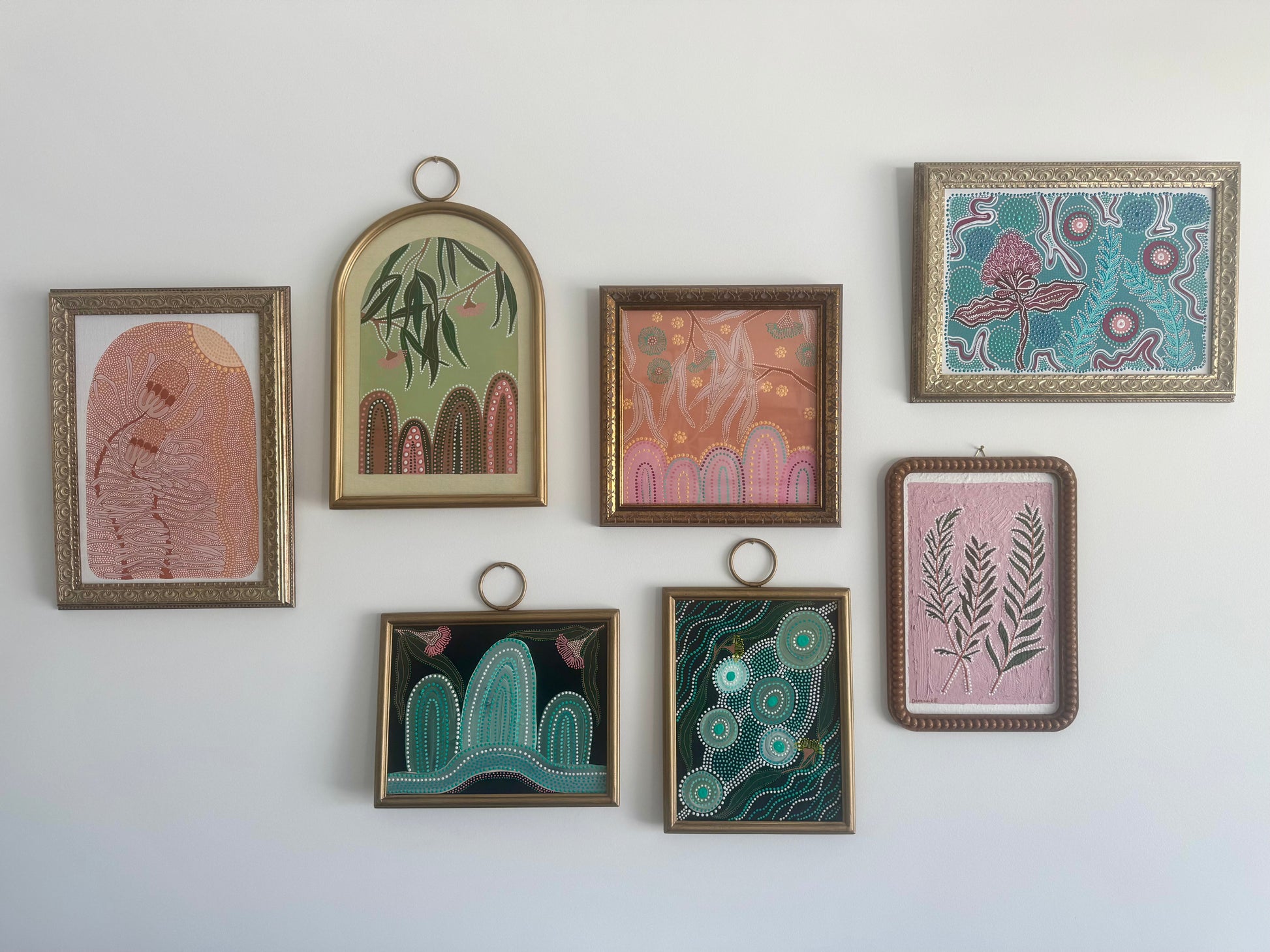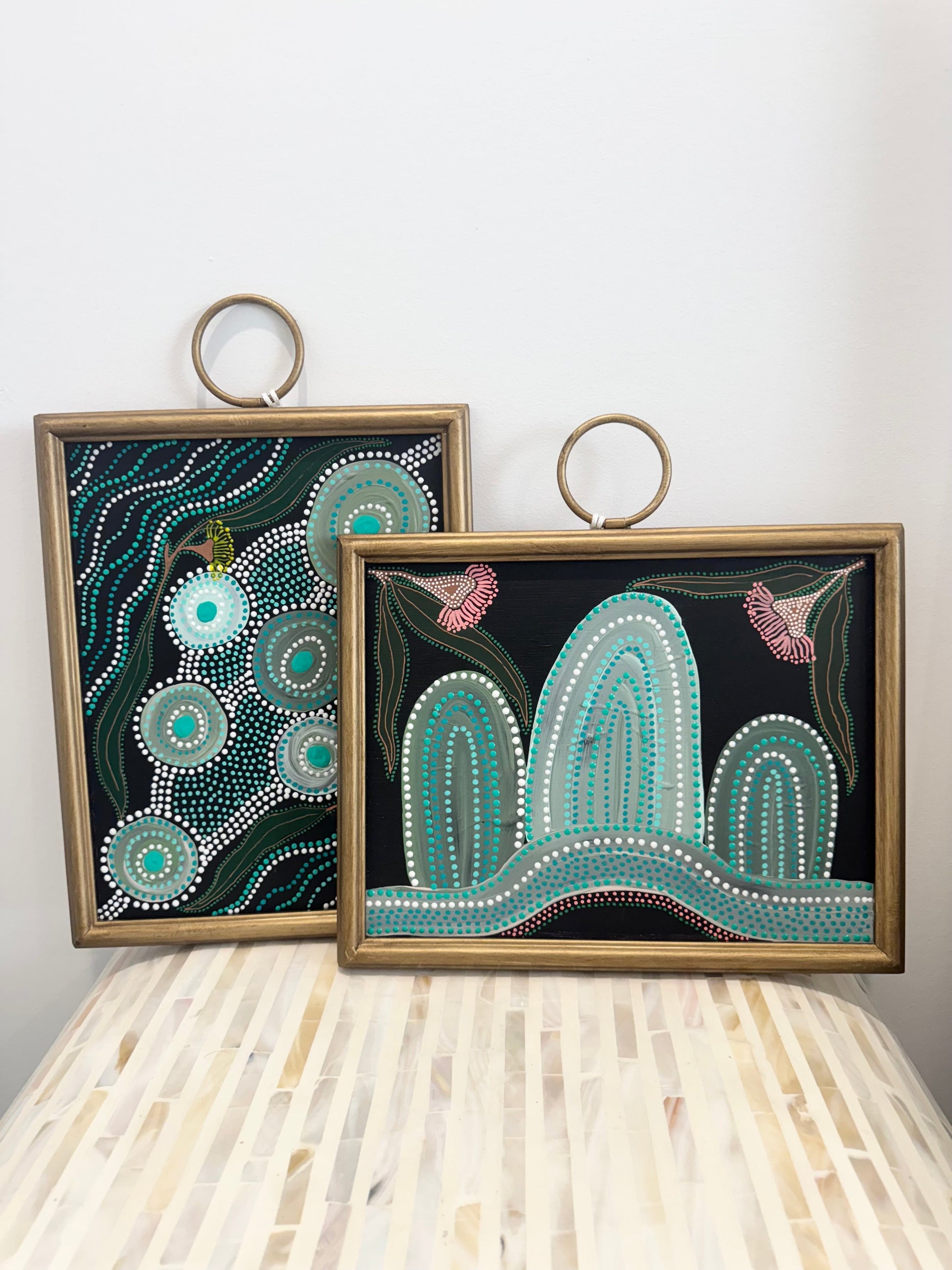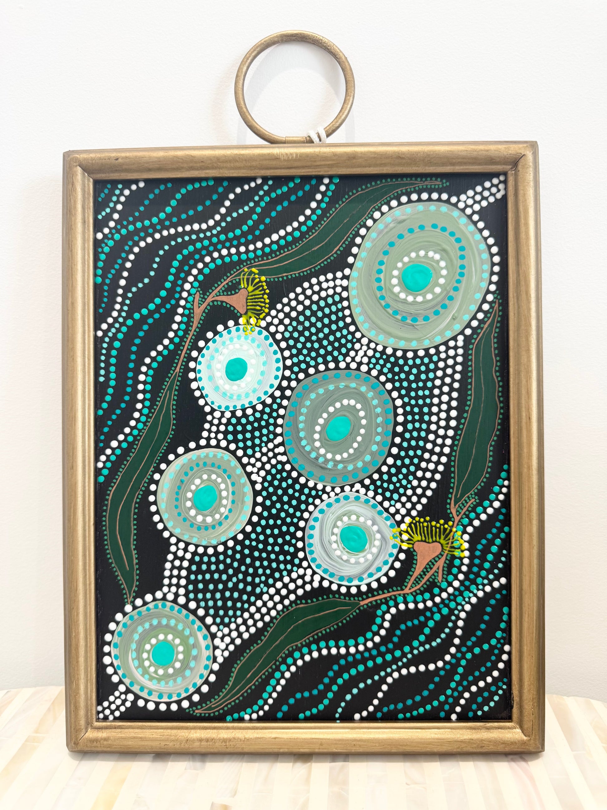 Under the Night Sky forms part of a small, exclusive collection framed in unique vintage-style frames, a departure from my usual modern presentation. Set against a rich black backdrop, the artwork features teal and white meeting circles, flowing dotted pathways, and delicate yellow gum blossoms, symbolising connection, gathering, and the strength of nature after sunset. This piece blends traditional Aboriginal symbolism with a bold contemporary contrast, making it a striking statement for any space